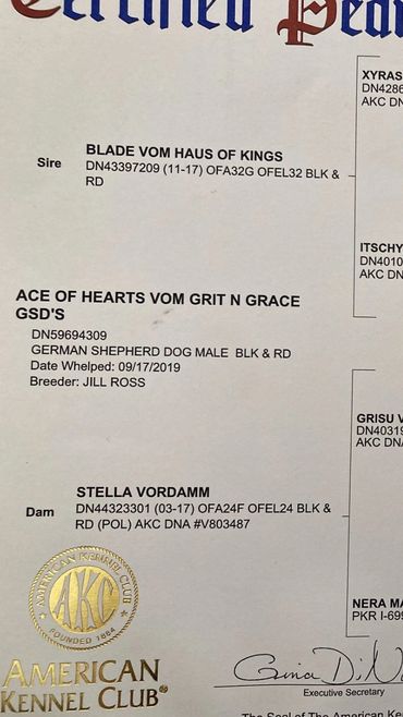 ACE HAS BEEN CERTIFIED THROUGH THE CANINE HEALTH INFORMATION CENTER O.F.A. WITH GOOD HIPS AND NORMAL ELBOWS.